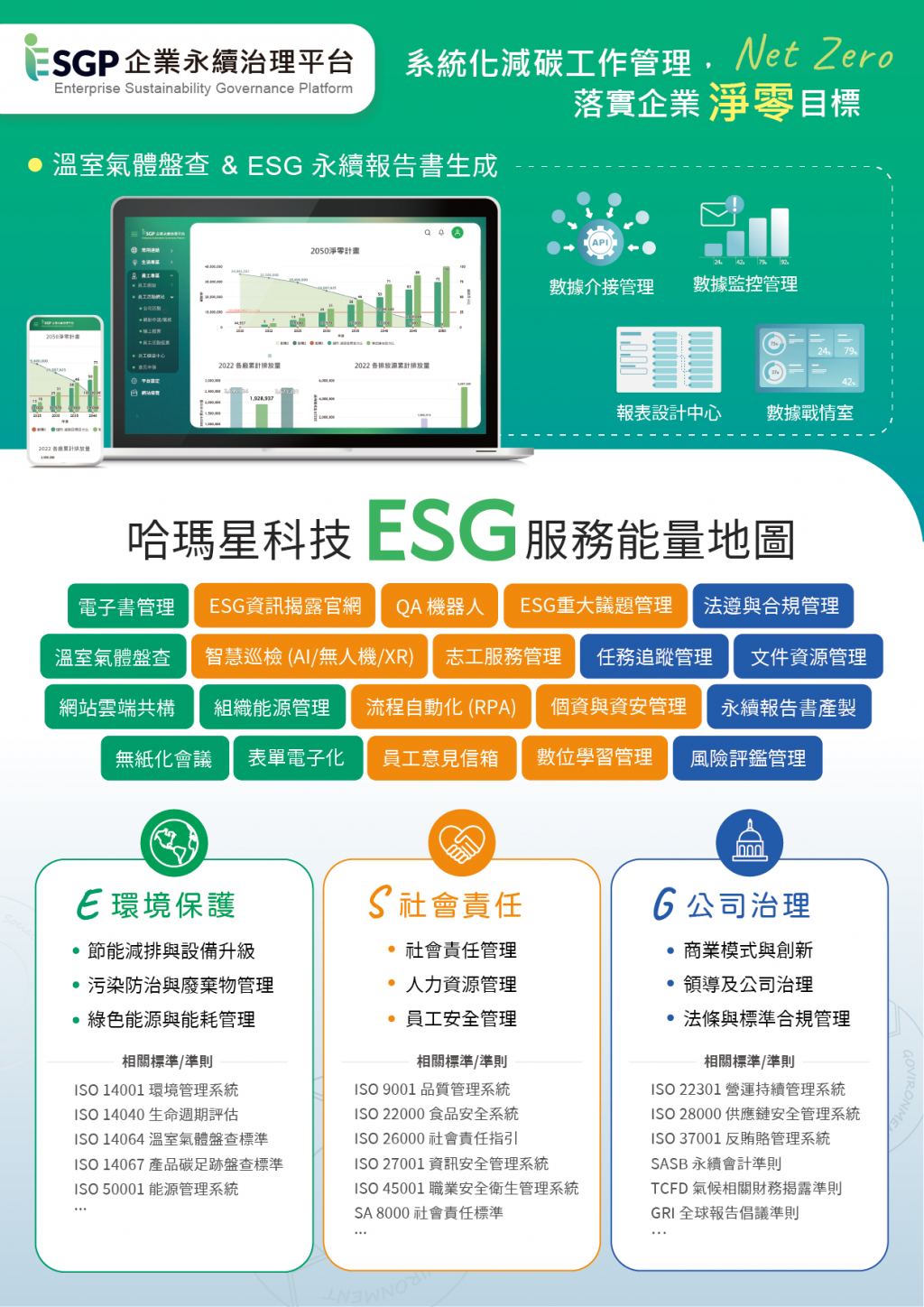 ESGP (Enterprise Sustainability Governance Platform): This platform aids businesses in conducting automated carbon footprinting, utilizes AI technology to generate sustainability reports, effectively manage ESG information, and produce various reports tailored for different stakeholders.