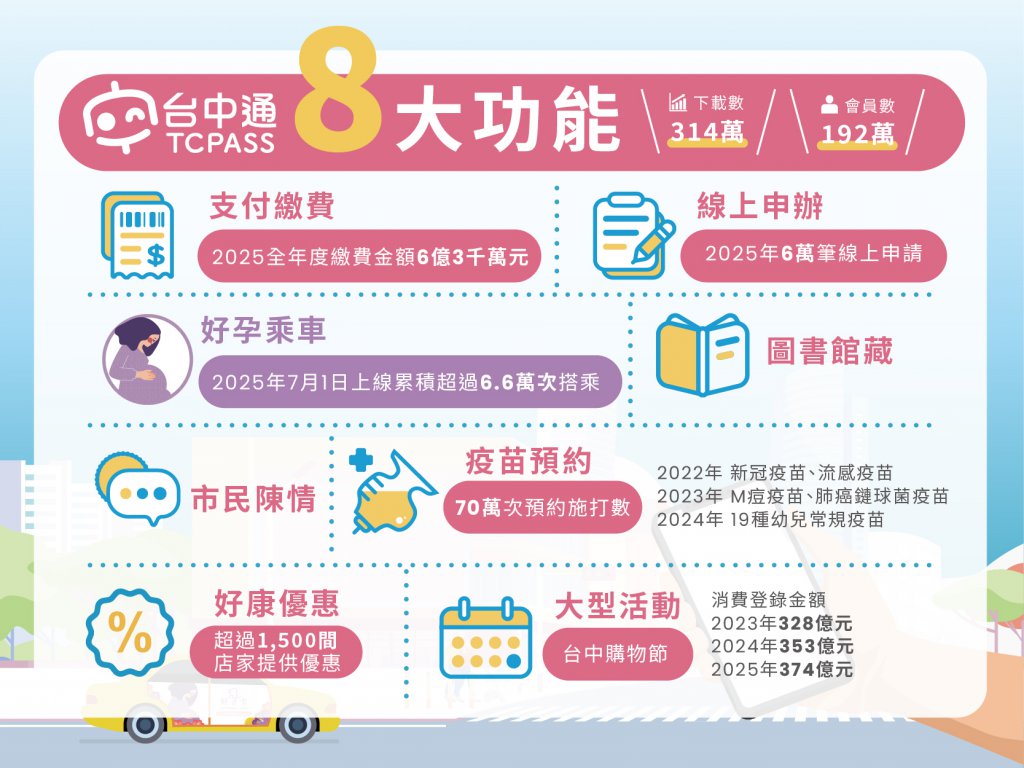 TCPASS app provides a comprehensive integration of municipal services, including mobile payments, "Maternity Taxi" bookings, vaccine appointments, online applications, event calendars, and various welfare updates. Members can use their Digital Citizen Card to access exclusive discounts at over 1,500 partner stores across Taichung and Nantou, including famous chain brands, local delicacies, and Top 10 Souvenir shops. TCPASS has become a highly acclaimed tool, making diverse digital services effortlessly accessible to all citizens.