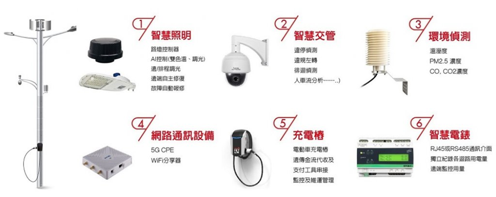 •Smart poles integrate digital signage, IP cameras, high-efficiency street lamps, roadside units, 5G small cells, and EV chargers.
